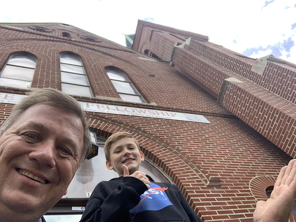 Prof. Musial with super-star student Rafal Wolosz (who composed the song with him) on the steps of the old Precious Blood Church where Musial first learned about "Dyngus Day"! |