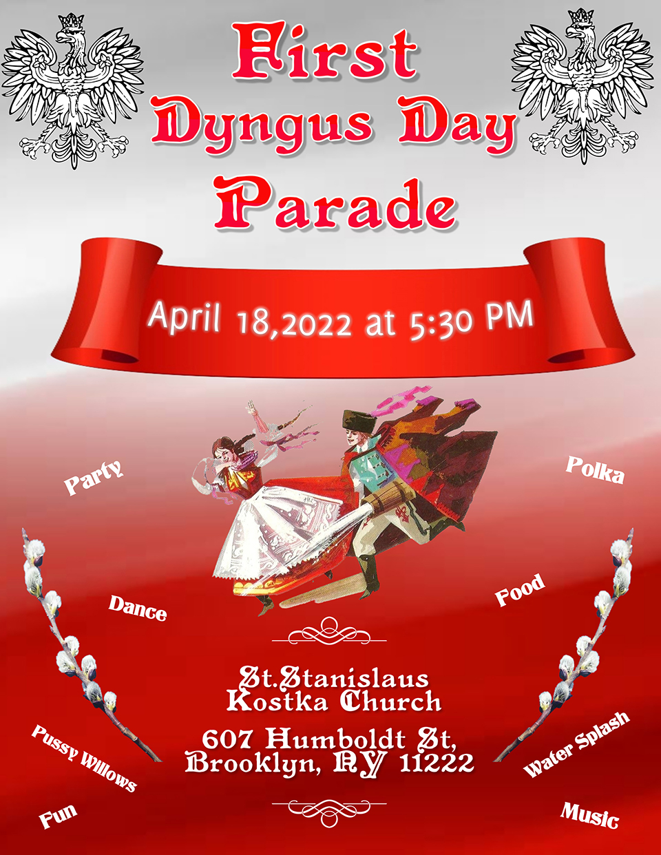 The First DYNGUS DAY Parade In New York City Music Website: DyngusDaySongs.com Contact: PHONE #917-626-5956 eMail Director@DyngusDaySongs.com The main organizer is father Grzegorz Markulak. Martyna Sokol is our Public Relation contact. David Musial is the audio, sound system and video producer. Kasia Drucker is a music producer. She also designed the Poster for the First Dyngus Day Parade.